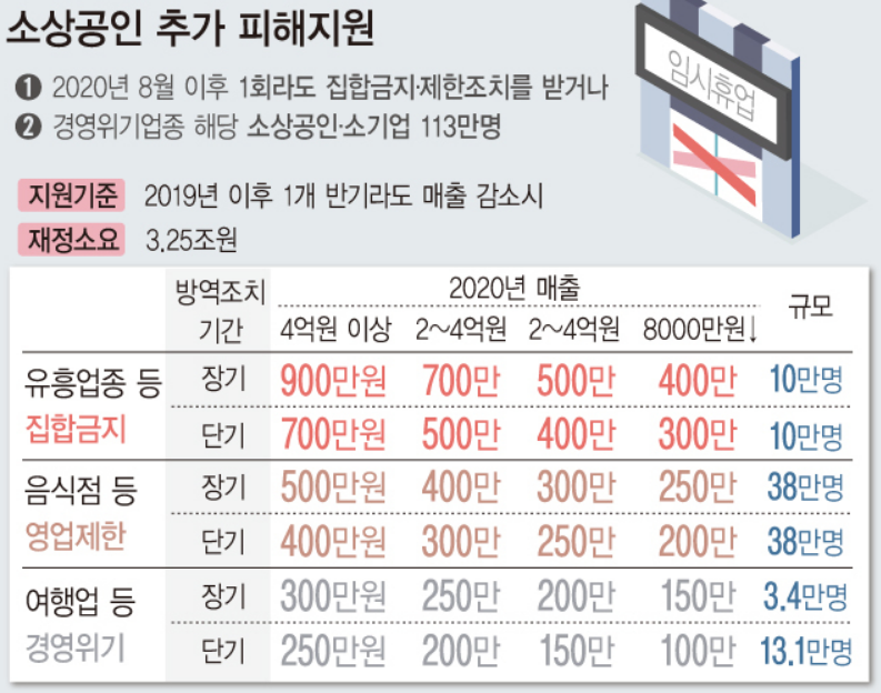 총 0.6조원의 피해지원을 할 예정이며 사업소득의 감소분만큼의 금액이 지원될 예정입니다. 이는 방역조치의 수준이나 기간에 따라 신청인의 소득과 규모 등을 종합적으로 고려해서 결정되는 만큼 지켜보셔야 할 사항일 듯 싶습니다.