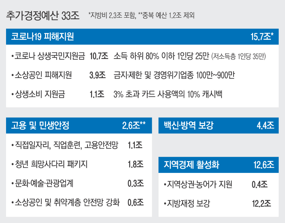 전제적인 코로나19 피해지원으로 33조를 추가경정예산으로 잡았습니다. 기준소득 하위 80%를 기준으로 코로나 상생 국민지원금을 1인당 25만원씩 (저소득층 1인당 35만원) 지급하며 소득 상위 20%를 기준으로 상생소비 지원금이라는 이름으로 신용카드 캐시백을 기준달에 비해 초과 사용한 금액만큼의 10% 캐시백을 지급한다고 합니다.